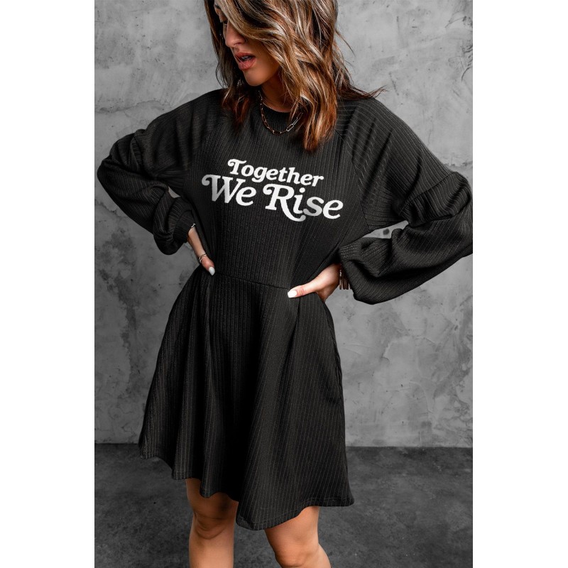 Black Together We Rise Letter Print Empire Waist Ribbed Knit Dress